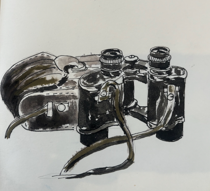 “Todays effort feels very poignant . Today is my late Mums birthday and these are her binoculars.. growing up , the view from our living room was Cook Strait and Mum was often to be found with these , looking out across the strait. I remember the distinctive click of the catch on the beautifully crafted leather case as she opened it to check out something interesting! I drew them with one of my Dads pencils, last touched by him 60 years ago, sketched with his pens and my late sisters inks. A few tears were shed thinking how I love and miss them”